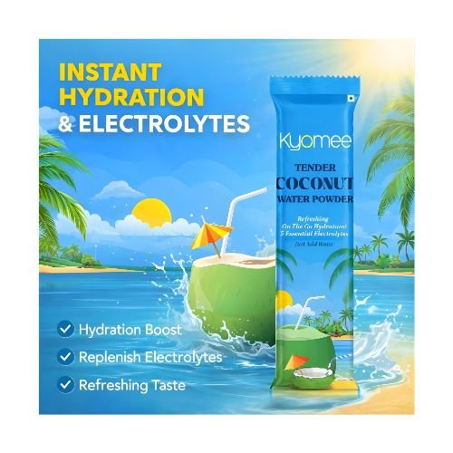 Whether you are working out, traveling, at the office, or relaxing at home, KYOMEE Tender Coconut Water Powder keeps you hydrated and revitalized throughout the day. It supports muscle function, reduces fatigue, and helps maintain fluid balance naturally.